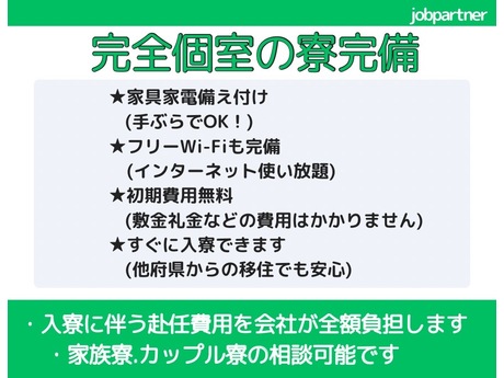 ・ 寮費無料/家具家電付きの個室寮完備